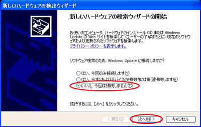USBドライバの自動インストール開始時に、「ソフトウェア検索のため、WindowsUpdateに接続しますか?」と尋ねられます。