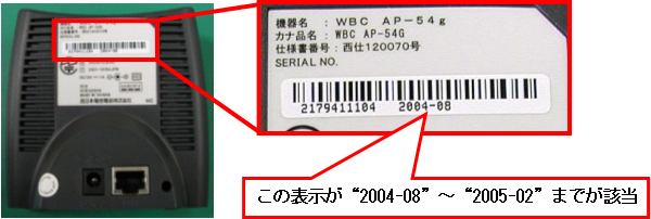 NTT西日本が平成15年11月から販売している無線LANアクセスポイント「Web Caster AP-54g」のうち、平成16年8月から平成17年2月までに製造した機器(以下、本機器)において、お客様のご利用環境によって、無線LANが使用できない事象が発生する場合があることが判明しました。