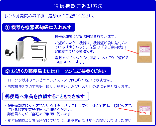 「回収キット」の中には料金着払いの伝票を貼付した回収用の袋を同封しておりますので、お手数ですがレンタル機器を封入後、郵便局への集荷依頼または郵便局・ローソンへの持ち込みによりご返送願います。 |