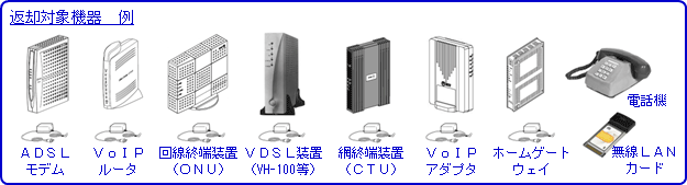 | 移転、アップグレード等によりADSLモデム等が不要になった場合、その他弊社よりレンタルでご提供している通信機器のご利用終了後は以下の方法にてご返却いただきますようお願いいたします。 |