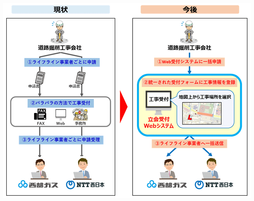 西部ガスおよびNTT西日本は、本Webシステムを利用した共同受付を開始し、年間約2万件※3にもおよぶ受付業務の効率化を図ります。また、道路掘削工事会社が複数のライフライン事業者へワンストップで申請可能となる仕組みを、西日本エリアで初めて実現し、建設業界の働き方改革やDX推進などの社会課題の解決に取り組んでいきます。