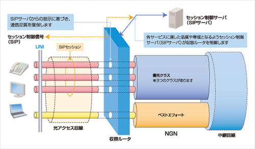 NGNでは、多彩な通信サービスに最適な形で対応するべく、従来の「ベストエフォートクラス」に加えて、品質確保型の「優先クラス」をご用意しています。「優先クラス」は、テレビ電話のような厳しいリアルタイム性が必要な通信や、片方向の映像配信のような緩やかなリアルタイム性が要求される通信のためのものです。品質確保「QoS」機能により、安定した音声通話や高精細映像の配信をご提供します。