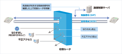 NGNでは、回線ごとに割り当てられた発信者IDをチェックし、なりすましを防止します。また、ネットワークの入り口で、なりすましや不正なアクセスをブロックする機能などを具備しています。
