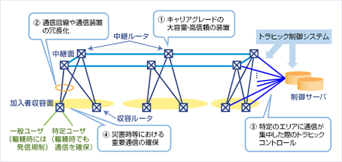NGNでは、電話サービス事業等で培ったネットワークを安定して運用するための技術とノウハウが活かされています。キャリアグレードの大容量・高信頼装置の採用と、通信回線や通信装置の冗長化に加えて、災害発生時やトラヒック集中などの、さまざまな状況を想定して、トラヒックコントロールや重要通信の確保など、お客さまに安心を提供するためのさまざまな先進技術を採用しています。