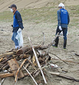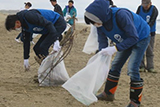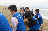 当日は冷たい雨が降りしきる荒天の中、NTT西日本鳥取グループから社員や家族、OBの94人が参加しました。大木や漁具、ロープといった大きな漂流物や、砂に埋もれたビニール、プラスチックなどのごみを拾い集め、参加者が一丸となって鳥取砂丘の美化に努めました。