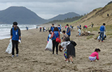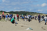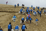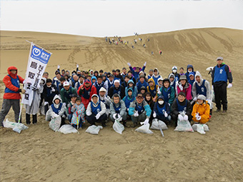 今春は4月15日に行われ、当日は珍しく風が強く、最初は小雨も混じる寒い中でしたが、参加者全員一体となって鳥取砂丘の美化に努めました。