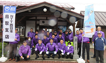 NTT西日本の高速インターネットサービス「隼」つながりで、地域に貢献しながら、ともに発展していきたいという思いから地域貢献活動の一環として、2012年から毎年実施しています。当日はNTT西日本 鳥取グループ29人が隼駅の清掃活動に参加しました。小雨の降りしきる中、駅の看板や窓ガラス清掃のほかホームや駅周辺の除草やごみ拾い、約30分でごみ袋20袋分のごみが集まりました。