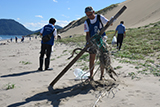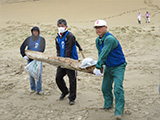 当日は30度を超える猛暑の中でしたが、鳥取砂丘の「馬の背」を越えた海岸に漂着したロープや網といった漁具や砂に埋もれた流木等、多くのごみを拾い集めました。