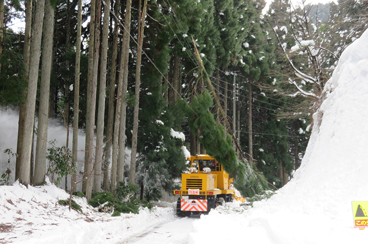 鳥取県では、2023年1月に降った大雪の影響で、倒木による集落の孤立や停電等の被害が相次ぎました。被害が出た集落が多数あった一方、事前に道路沿いの木を伐採していた地域では、倒木による被害が少なかったことから、NTT西日本 鳥取支店では、鳥取県や各市町村、中国電力等と連携し、倒れると通信設備に被害を及ぼす可能性がある木を事前に伐採するしくみづくりの検討を行っています。主な道路沿いの木の伐採だけでなく、携帯基地局につながる林道等にある危険木の伐採方法等についても議論を進めています。引き続き、万一の災害時における重要通信の確保および早期復旧をはじめ、現在活用中のelganaによる関係機関との被災情報連携についてもさらなる高度化を進める等、災害対策のICT化に取り組んでいきます。