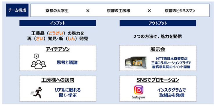 NTT西日本 京都支店は、NPO法人京都西陣町家スタジオ、株式会社電気蜻蛉、京都産業大学、京都府、京都市とともに伝統的な工芸品が持つ魅力を再定義し、新しい表現・展示の方法を通じて工芸品の新たな顧客層の獲得をめざす「アイデアソン※」と「展示会」を掛け合わせたイベント「さいしんこうげい」を開催しました。このイベントでは、アイデアソンの参加者である京都産業大学の学生と社会人が1つのチームとなり、パートナーとなった工房の工芸品や歴史、職人の人柄といった魅力をSNSと展示会でいかに発信するかにチャレンジしました。地域と一体となって工芸(こうげい)の魅力を「再(さい)発見・新(しん)発見したい」という思いを込めて、イベントを「さいしんこうげい」と名付けました。