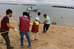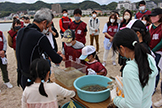 清掃ボランティアの後は、海底を耕す「海底耕耘(こううん)体験」と「浜辺の学習会」を行いました。海底耕耘は、海に投入した鉄製器具をロープに結んで海岸から引っ張り、海底を耕す作業です。貝等の堆積物をかき混ぜ、硬くなった土や泥・砂を掘り起こし、海底にたまっている窒素やリン等の栄養塩を海に放出する効果があります。