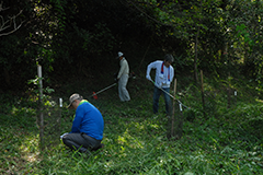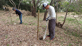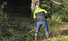 初回の活動には8名の社員が参加し、安全講習の後、主に根笹(ネザサ)やニセアカシアを伐採しました。ニセアカシアは痩せた土地でもよく生育するものの、根が浅く大雨が降ると地表面が流されやすいため土砂災害の要因になりやすく、根笹の群集は生物が住みにくくなる要因と考えられています。
