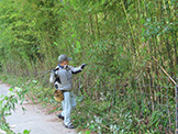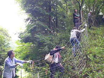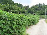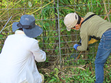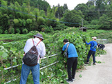 その後作業が始まり、参加者はイノシシ除けのフェンス周りに生い茂った雑草の刈り取りと竹林の伐採等を行いましたが、ワイヤーフェンスに絡み付いたつるを取り除くのは思いのほか難しく、炎天下での力仕事とあってすぐに汗だくになりました。