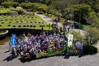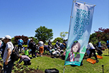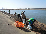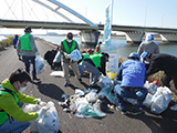 しかし今回は事前申込み制で参加定員を半分程度に減らし、受付時にも体温測定と体調チェックを行う等、感染防止対策に万全を期しました。最初にセレモニーが行われた後、参加者は2班に分かれて徒歩で清掃場所まで移動しました。一時間ほどの作業で快い汗を流し、終わるころには堤防沿いに回収したごみ袋の山ができました。