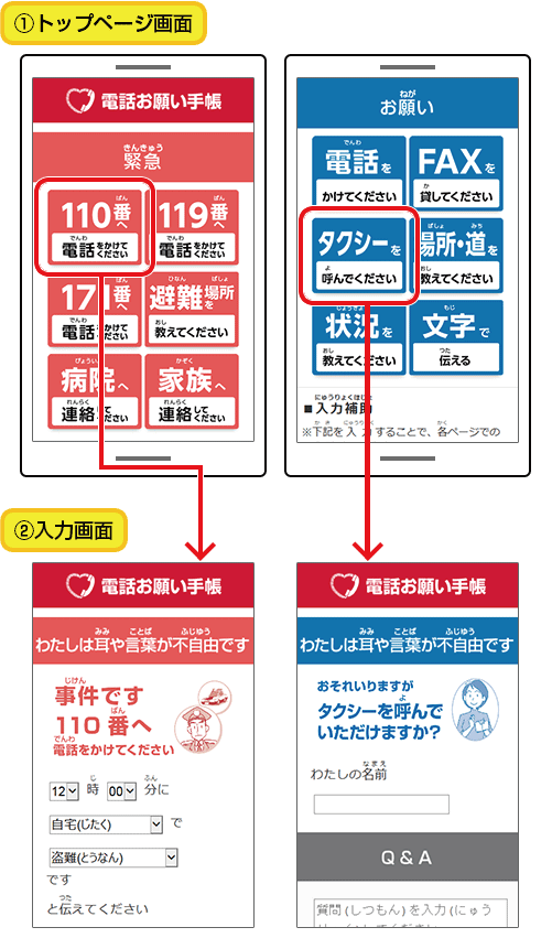 NTT西日本では、耳や言葉の不自由な方向けに、外出先でのコミュニケーションツールとして1983年より「電話お願い手帳」(冊子版)を継続して発行してまいりましたが、近年、インターネットに接続できる携帯端末(スマートフォン、タブレット、フィーチャーフォン等)の普及が進んでいることを踏まえ、「電話お願い手帳WEB版/アプリ版」を提供しております。ぜひご利用いただきますようお願いいたします。