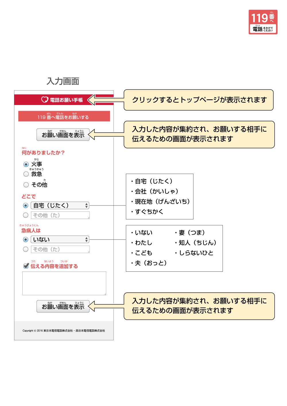 何(なに)がありましたか? 火事(かじ) 救急(きゅうきゅう) その他(た) どこで 自宅(じたく) 会社(かいしゃ) 現在地(げんざいち) すぐちかく 急病人(きゅうびょうにん)は いない わたし こども 夫(おっと) 妻(つま) 知人(ちじん) しらないひと 伝(つた)える内容(ないよう)を追加(ついか)する
