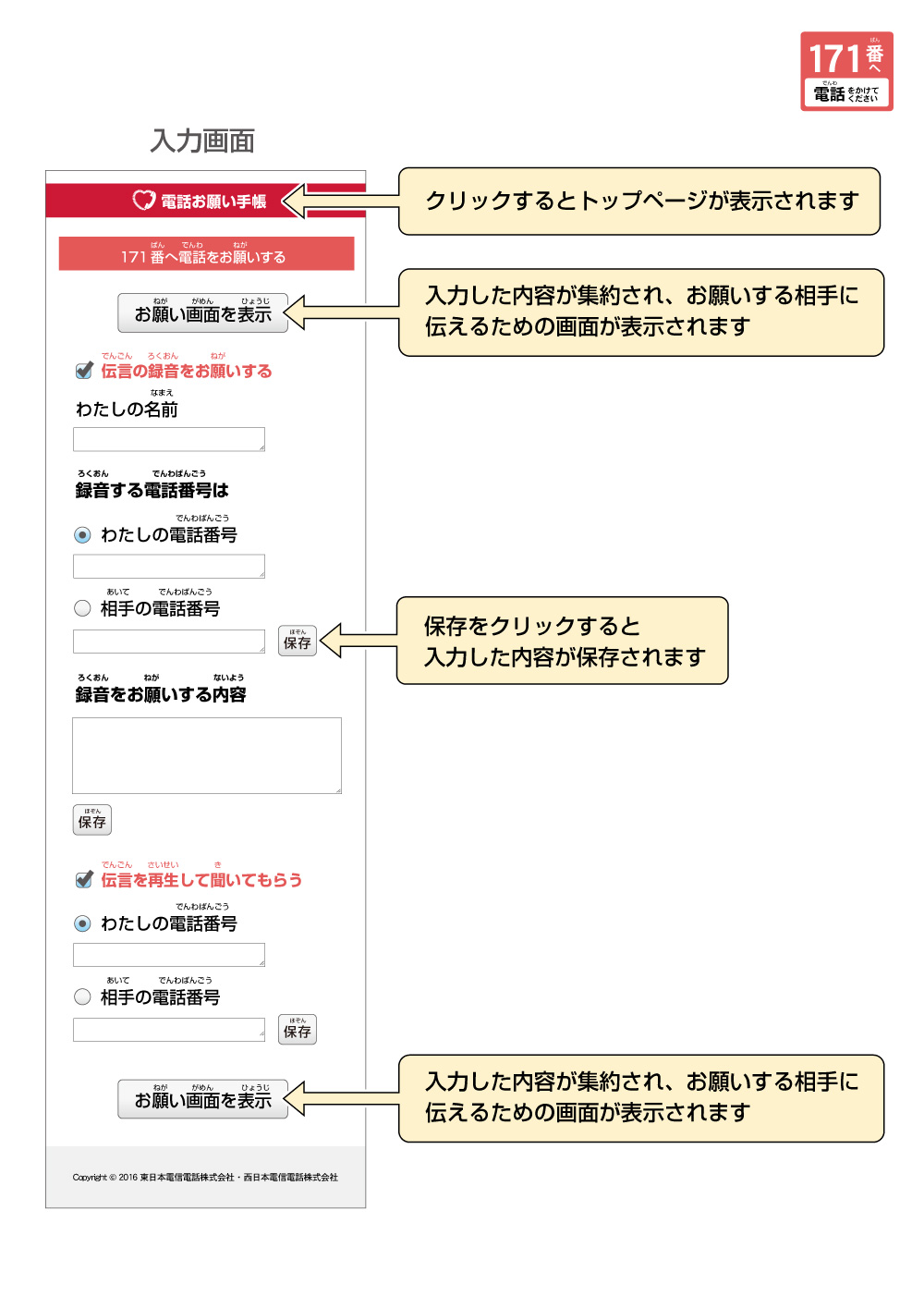 伝言(でんごん)の録音(ろくおん)をお願(ねが)いする わたしの名前(なまえ) 録音(ろくおん)する電話番号(でんわばんごう)は わたしの電話番号(でんわばんごう) 相手(あいて)の電話番号(でんわばんごう) 録音(ろくおん)をお願(ねが)いする内容(ないよう) 伝言(でんごん)を再生(さいせい)して聞(き)いてもらう 再生(さいせい)する電話番号(でんわばんごう)は わたしの電話番号(でんわばんごう) 相手(あいて)の電話番号(でんわばんごう)
