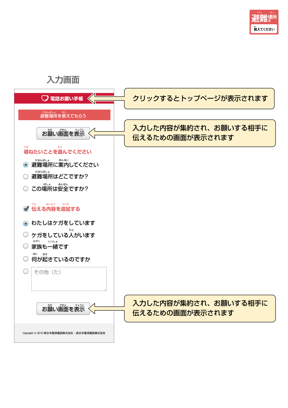 尋(たず)ねたいことを選(えら)んでください 避難場所(ひなんばしょ)に案内(あんない)してください 避難場所(ひなんばしょ)はどこですか? この場所(ばしょ)は安全(あんぜん)ですか? 伝(つた)える内容(ないよう)を追加(ついか)する わたしはケガをしています ケガをしている人(ひと)がいます 家族(かぞく)も一緒(いっしょ)です 何(なに)が起(お)きているのですか